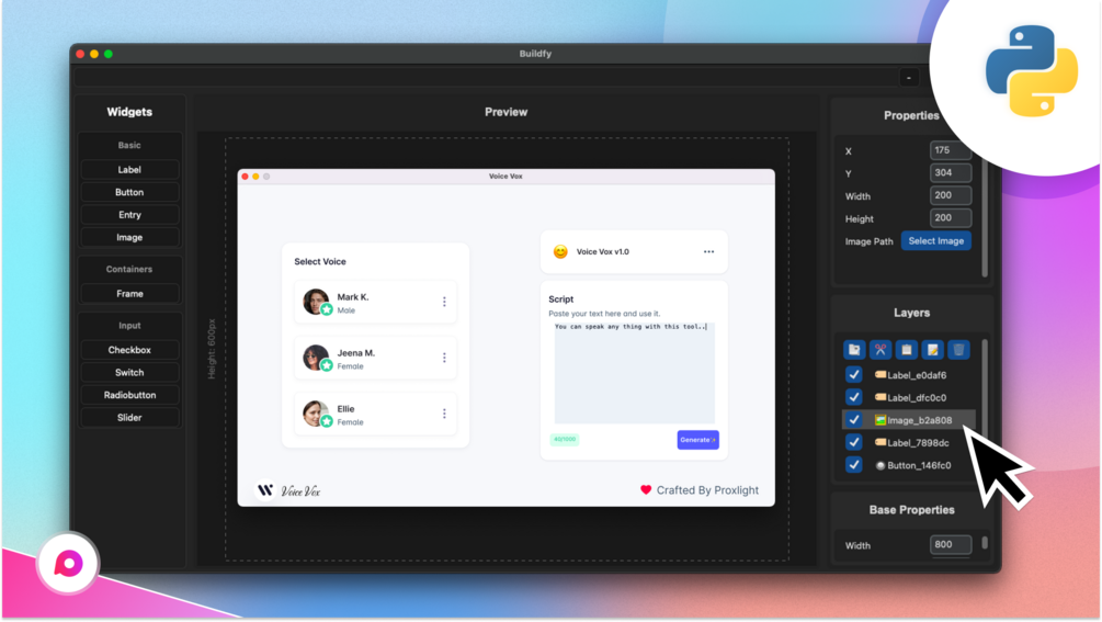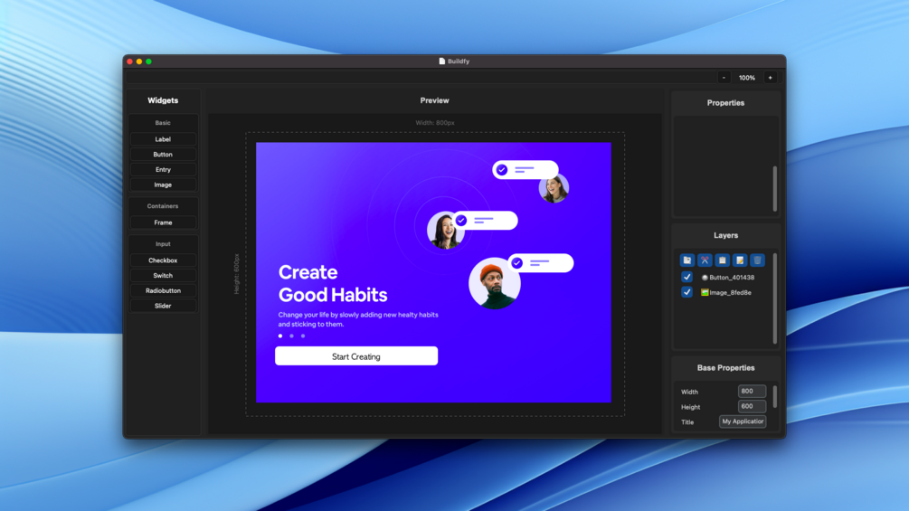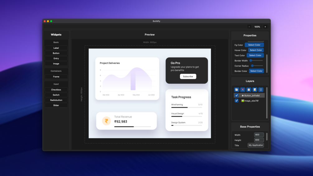 With Buildfy 2.1, you can design visually, let AI generate widgets & layouts, and export fully working apps powered by the customtkinter framework.
